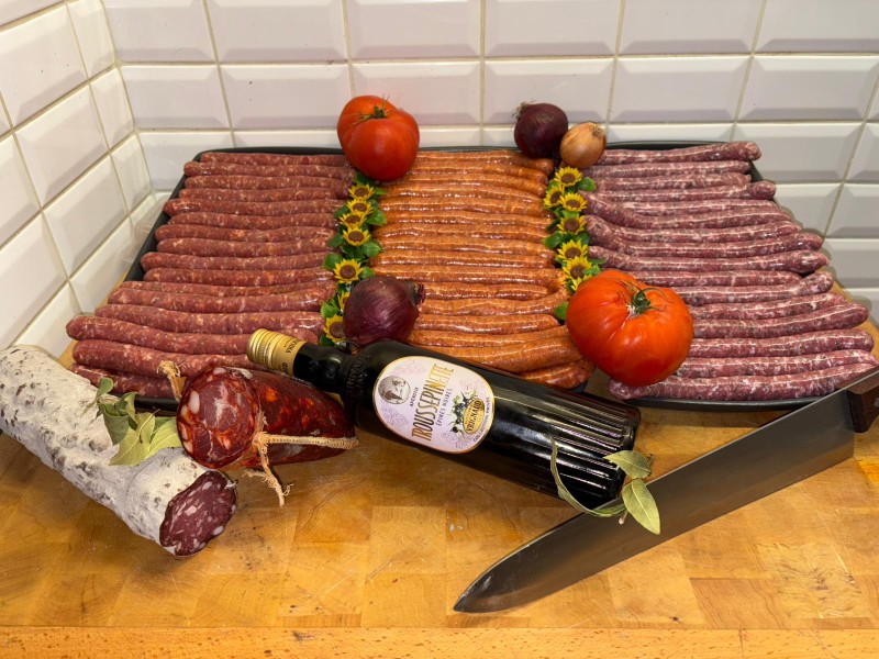 Profitez d’un assortiment gourmand de trois variétés de saucisses maison : nature, épicée et aux herbes aromatiques. Chaque saucisse est préparée avec passion et des ingrédients naturels, offrant une palette de saveurs équilibrées et généreuses. Présenté avec des saucissons secs soigneusement sélectionnés et accompagné d’une bouteille de vin rouge, ce coffret est idéal pour sublimer vos barbecues, pique-niques ou plateaux charcuterie. Un voyage gustatif à travers les spécialités locales, alliant tradition et convivialité.