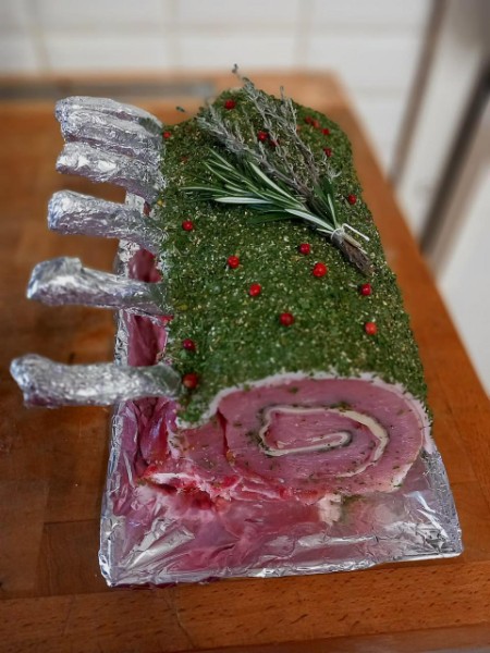 Le carré d’agneau en habit de fêtes est une pièce spectaculaire, roulée et enrobée d’un manteau d’herbes fraîches, baies roses et branches de romarin, pour un visuel et un goût exceptionnels. Cette préparation raffinée met en valeur une viande tendre et savoureuse, idéale pour vos repas festifs ou tables élégantes. Le mariage d’arômes subtils et la qualité de l’agneau sélectionné garantissent un plat à la fois gourmand et sophistiqué, parfait pour impressionner vos convives tout en restant fidèle à une cuisine traditionnelle et authentique.