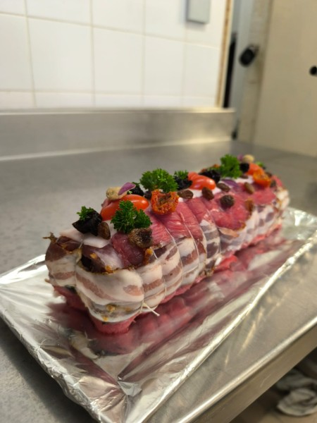 Succombez au charme de notre rôti de fêtes fait maison, farci à la main et délicatement ficelé pour préserver toute sa saveur. Décoré de tomates cerises, de persil frais et de fruits secs, il allie élégance et gourmandise. Parfait pour vos repas de famille, fêtes ou occasions spéciales, ce rôti révèle une viande tendre et juteuse, sublimée par une préparation artisanale qui respecte les traditions. Offrez-vous un plat convivial et raffiné, synonyme de partage et de moments inoubliables.